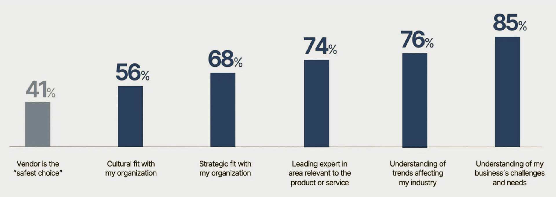 Recent research shows that 85% of buyers choose their consultant based on how well they understand their business’s challenges and needs. 76% said that understanding trends affecting their industry was one of the most important qualities. That’s far higher than brand reputation or cultural fit.